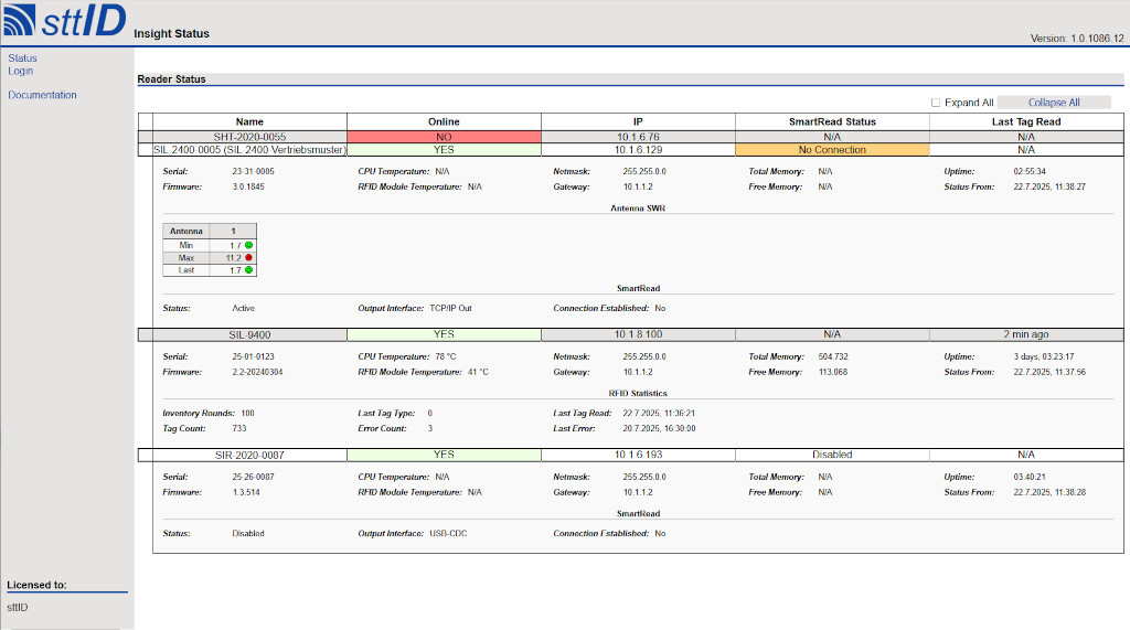 Die sttID Software Insight sammelt Statusdaten von mehreren sttID-Lesegeräten. Diese gesammelten Informationen stellt sie gebündelt allen Clients zur Verfügung, die per HTTP eine Verbindung zum Überwachungsdienst herstellen. Dadurch kann der Nutzer ohne zusätzliche Software ganz einfach per Webbrowser eine Übersicht über den Status der im Netzwerk befindlichen RFID-Leser abrufen und mögliche Ausfälle frühzeitig erkennen.